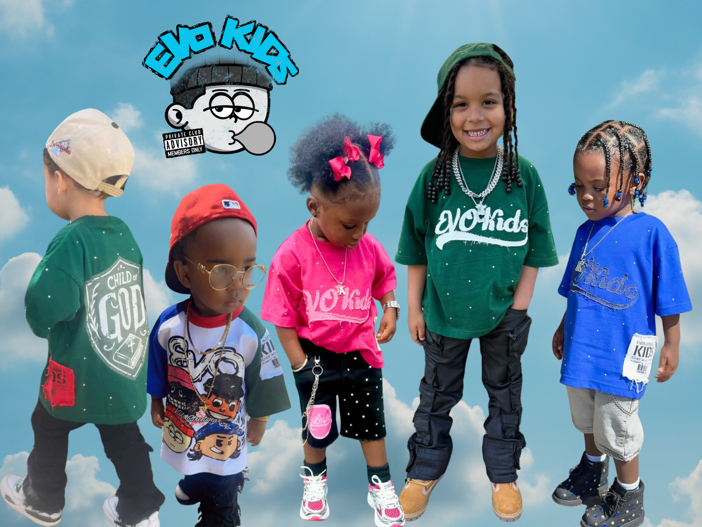 From our standout “Coming In Hot” set to the gritty EVO KIDS character tee and the rhinestone-detailed grayscale graffiti top, this launch is all about making noise, turning heads, and showing up with confidence. Designed for kids who know they were made to stand out—not blend in.